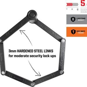 - DURABLE DESIGN: This Anti-Theft bike lock features a 12mm hardened steel shackle with a bent foot anti-rotation design that resists bolt cutters and twisting leverage attacks. The lock disc-style cylinder side keyway is protected by a sliding dust cover and is pick and drill resistant