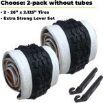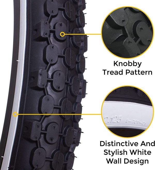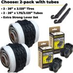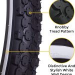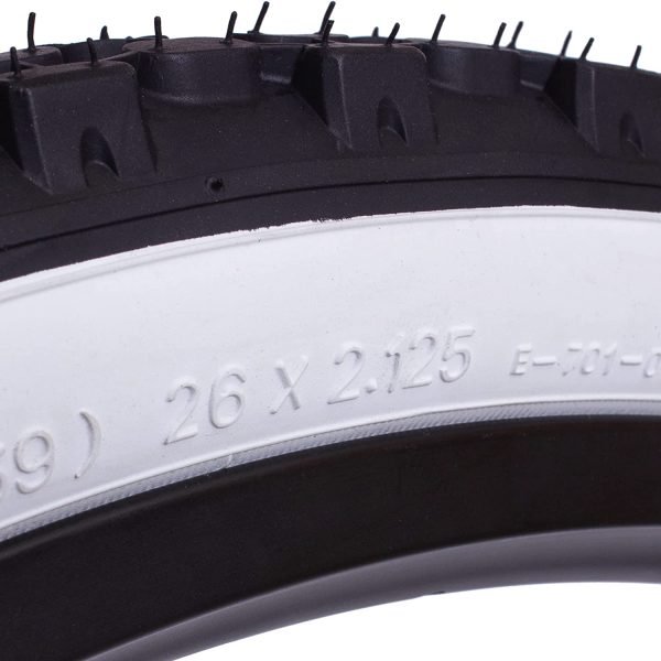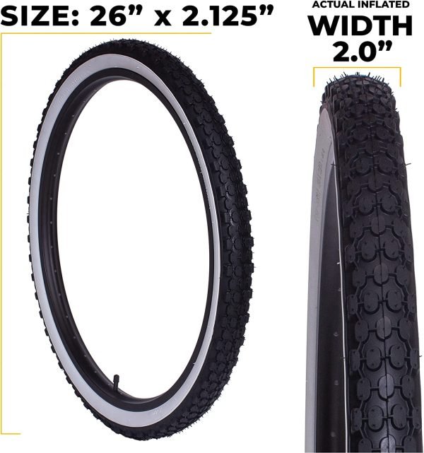 Classic White Wall Tires for your Cruiser Wheels and Beach Cruiser Bike Accessories Upgrade or Retro Project. 26 x 1.95 White Wall Bicycle Tires Available With or Without Tubes. 1 Pack or 2 Pack. 26 INCH BICYCLE WHITE WALL TIRES – For your Beach Cruiser rims. Every order includes Tire Levers. UPGRADE instead of just REPLACE – Our Premium Replacement parts are an upgrade from the products that came on your complete bike. We’ve been producing bicycles and fitness products for more than 20 years and these replacement kits are just what you need if you’ve been let down by the blow outs and flat tires that came on your bicycle. BEACH CRUISER WHEELS – will enjoy this refreshing retro tread pattern and look that has been tried and true since the 1950’s Balloon Wheels spec’d on white wall beach cruiser tire bikes . HIGH QUALITY TOOLS INCLUDED – We give you everything you need for a fresh reliable aftermarket upgrade including premium quality inner tubes (OPTIONAL) and high quality tire levers that won’t snap when you look at them (ours are made of reliable fiber reinforced plastic ). Like I said we’ve been doing this for 20 years and going. your satisfaction is our job. ve been building and innovating bicycle and fitness products for more than 20 years. While we might be new to Amazon we built this brand on Customer Service that is second to none and if you have any issues with our products we are here to take care of you.