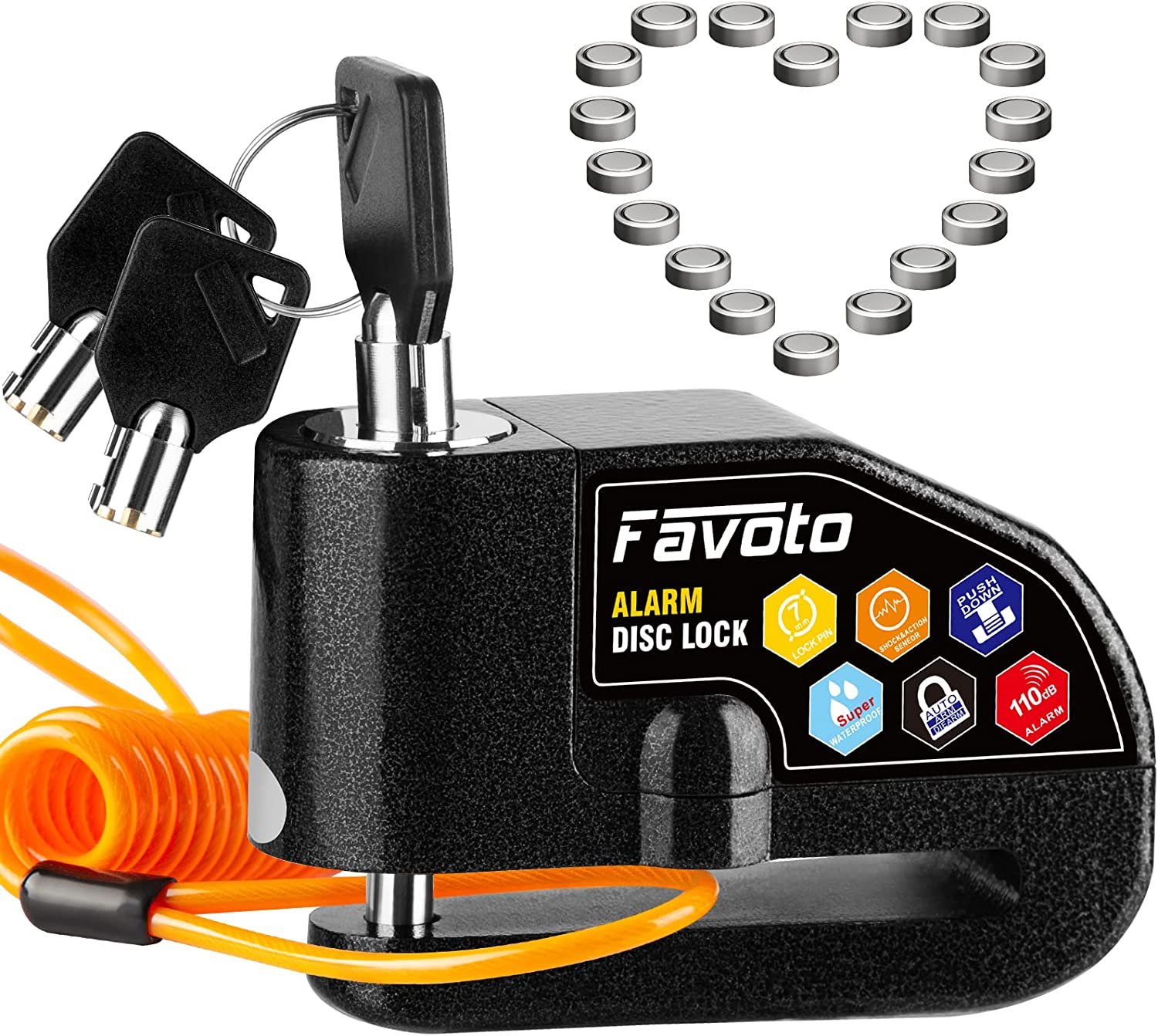 Favoto Alarm Disc Lock, 3 Keys and 18 Batteries (5-Year Availability), 110 dB Waterproof Anti-Theft Security Brake Padlock, 7mm Lock Pin with Reminder Cable, Fit for Motorcycle E-Bike Bicycle Scooter