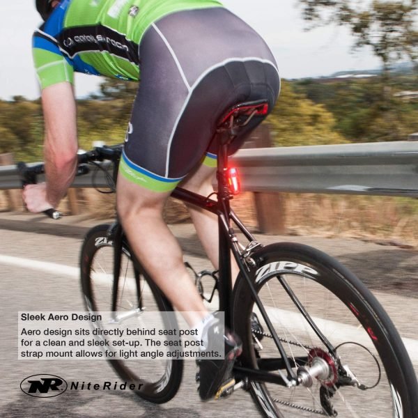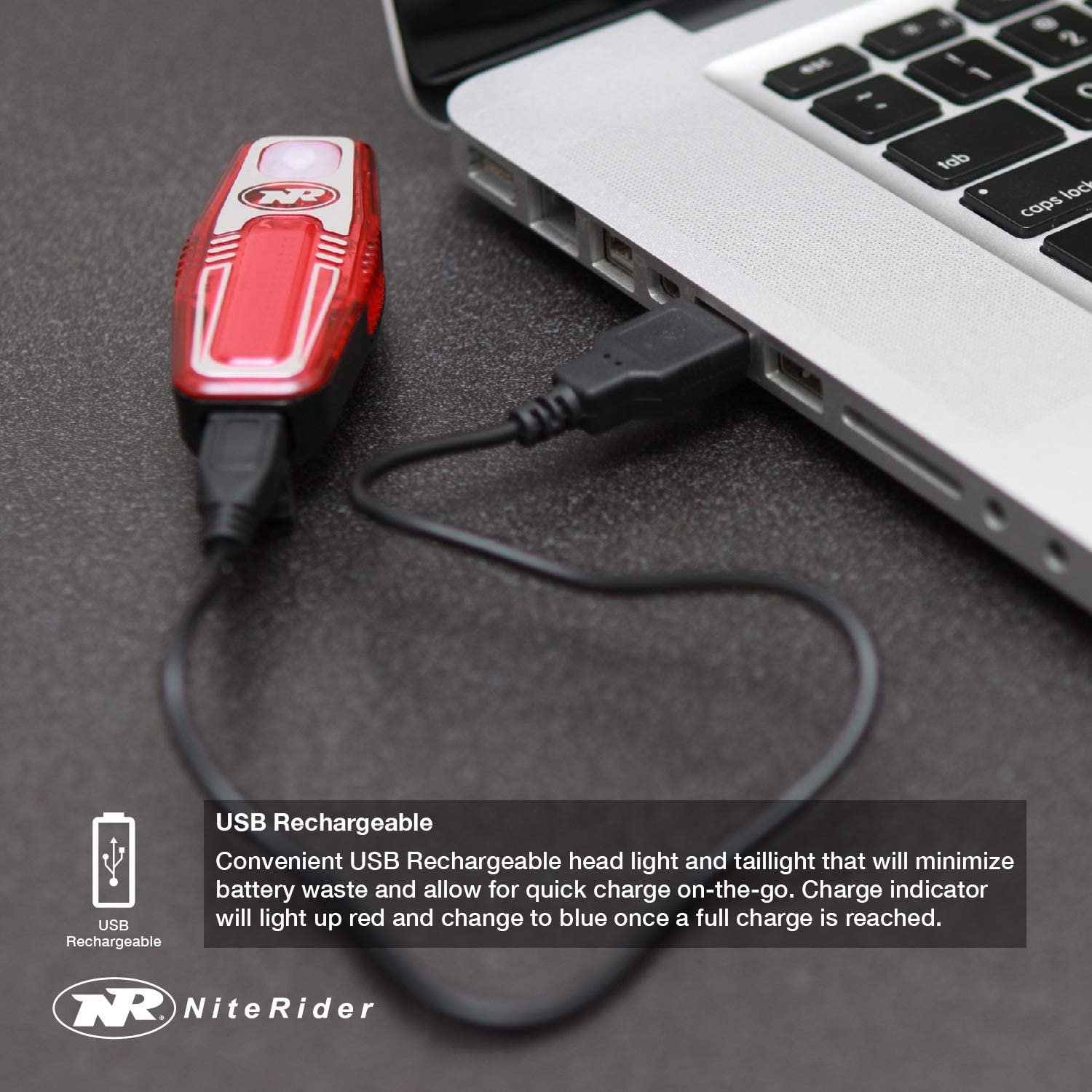 The NiteRider Lumina 1000 Boost is the perfect light for mountain bikers, road riders, adventure riders and urban commuters. Featuring a proven design/ride tested handlebar clamp mount that is sure to remain Rock solid whether on the trail or pavement. Double clicking the power button activates Boost Mode, giving you the option to operate your light at 1000 lumens maximum light output! This self-contained light makes use of the intellicharge function, which charges the battery twice as fast as the normal charge rate when connected to a higher amp match adapter. With our custom engineered optics, the Lumina 1000 Boost projects a beam pattern that provides a generous spot and wide flood beam pattern of 1000 lumens! Run Times: Steady Low 6:00h @ 200 lumens, Medium 3:30h @ 375 lumens, High 1:00h @ 750 lumens, Boost 1:00h @ 1000 lumens, Pulse Flash 10:30h, Fast Flash 6:00h, and Walk Mode 26:00h @ 50 lumens. The Sabre 110 is a super bright, lightweight USB rechargeable LED taillight. It utilizes a multi LED array designed for eye catching visibility in both day and night. With the addition of Amber colored side lights, the Sabre 110 provides 180 degrees of protection. Sabre 110 Taillight Run Times: Pulse Flash 7: 00h, Flash 6:00h, Fast Flash 17:00h, Steady High 1:45h, Steady Medium 4:00h, and Steady Low 8:30h.