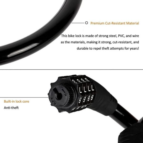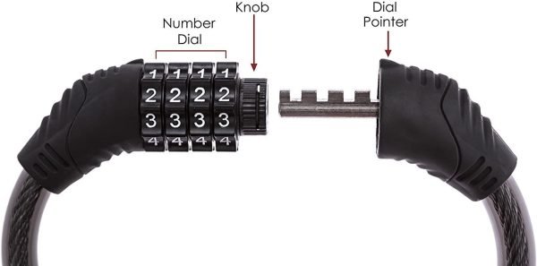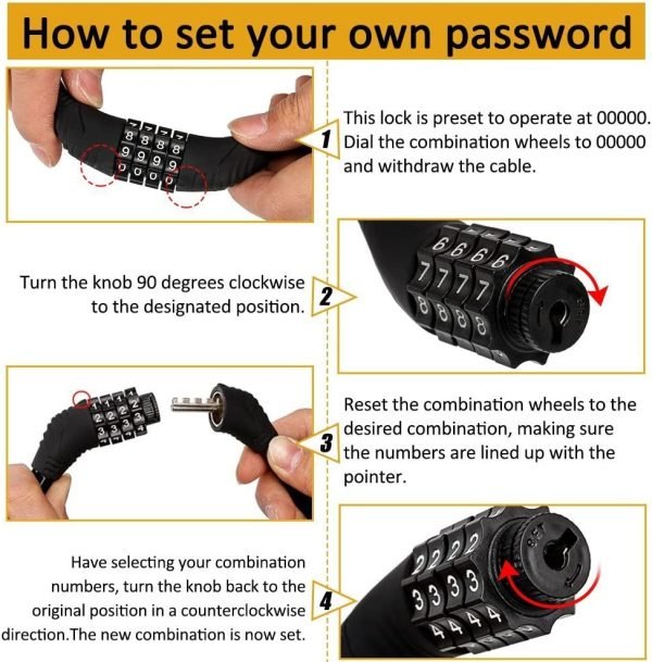 This is a resetable combination lock, you can reset the combination as often as you like. 🍁 Operating Instructions 🍁 This lock is preset to operate at 0000.To set your own combination,follow the steps below. ♻️ Dial the combination wheels to 0000 and withdraw the cable. ♻️ Turn the knob 90 degrees clockwise to the designated position. ♻️ Reset the combination wheels to the desired combination,making sure the numbers are lined up with the pointer. ♻️ Have selecting your combination numbers,turn the knob back to the original postition in a counterclockwise direction. ♻️ The new combination is now set. ♻️ Repeat the 1-5 steps above to reset the combination anytime you like. ❤️ Note❤️ Pls do not forget the password. Otherwise, we can not help you. SCRATCH PROOF — Protective ABS coating prevents our bicycle lock from scratching your bicycles, grills, golf carts, luggage, etc. WEATHER RESISTANT — Bike locks withstand the effects of wind, rain, sun & rust. ◕‿◕ Durable, Super anti-cut, Trustworthy; no keys, Password adjustable, easier to use. ◕‿◕ Engineering plastic shell and flexible steel cables, solid durable, no cracking at low temperatures, High temperature environments without distortion. ◕‿◕ Cable and hose, non-toxic and tasteless , Symbol of national and EU environmental standards and requirements. ◕‿◕ Integrated 4-digit resettable combination lock with indexed number dials for error-free combination setting, the original password is 0000 and easy to reset. 🏆 Size 🏆2′(0.6m) long x 1/2″ (12mm)diameter.