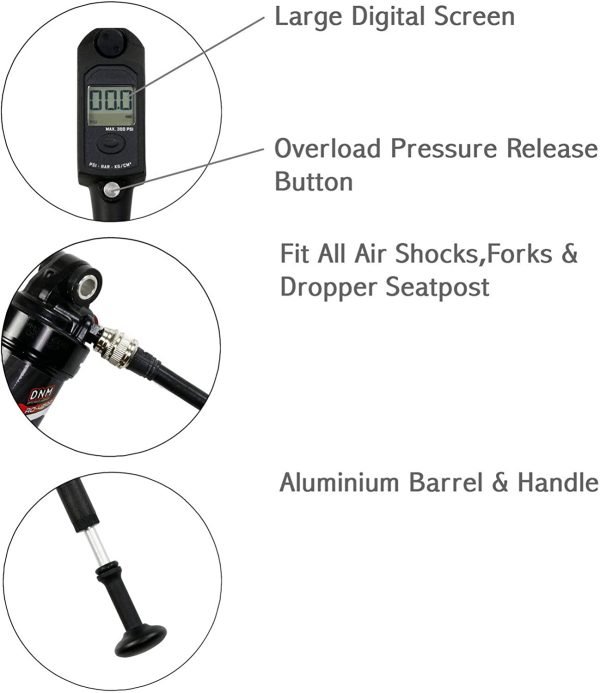 ACCURATE: Digital bike shock pump gives you exact pressure measurement. Much more accurate than a normal gauge pump. High pressure up to 300 PSI with clear digital gauge. Hi-tech LCD Display panel.QUALITY: The barrel is made of high-quality 6063 aluminium. It ensures pumping reliability. AIR BLEED BUTTON: You may have pumped too much air in the shocks or forks. The air bleed button allows releasing the excess air without disconnecting the pump hose. Micro-adjust 2-3 PSI air Bleeder.PORTABLE: Pump length 12.6 inches, weight is only 7.23oz. Very light and portable. You can carry it with you all the time.